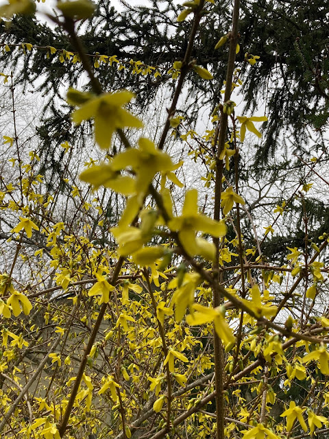 forsythia bushes. The sheltered one is blooming...Two others are not. When we moved to our current house 45 years ago, we planted a mock quince bush. Some years it blooms, some years not depending on how well we take care of it. This year in a week or so the mock quince will be full of red flowers. It's another home memory like horseradish.