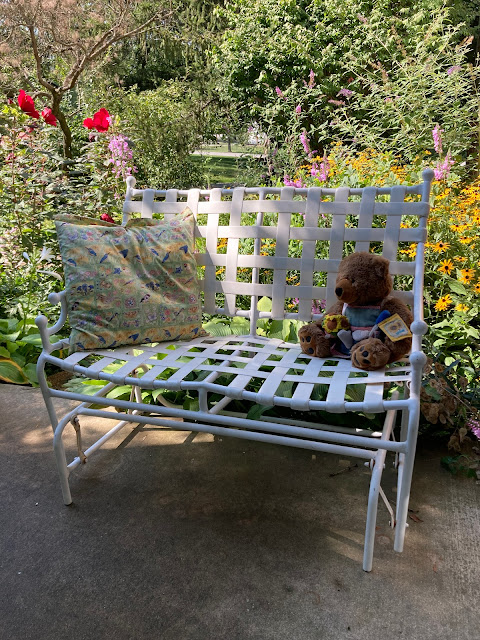 My little gardener bear, a gift many years ago from Eric and Kat gets a corner seat. A nice little addition to the patio. Later I went back and retrieved a common ordinary plastic chair that I cleaned and bleached. I'll find a place in the garden to sit and rest my tired bones on that chair. I'll add a cup of coffee while resting.I finished, no quit around noon. My knee today has not been happy. So this afternoon there were some simple things like pulling a few more weeds and taking a good sleep. Easy does it.